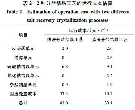 如第2.1節(jié)所述,熱法分鹽結(jié)晶工藝實(shí)現(xiàn)了硫酸鈉組分的部分資源化,回收了63.5%的硫酸鈉,結(jié)晶鹽產(chǎn)品綜合回收率44.4%。相較于完全得到雜鹽的零排放工藝而言,雜鹽產(chǎn)量已有大幅降低。但由于原水組成限制了硫酸鈉回收率的進(jìn)一步提高,同時(shí)也未能實(shí)現(xiàn)氯化鈉的回收,因此綜合回收率較低。第2.2 節(jié)所述的膜法分鹽結(jié)晶工藝將硫酸鈉的回收率提高至89.6%,同時(shí)回收了83.3%的氯化鈉,結(jié)晶鹽的綜合回收率達(dá)到82.2%。綜合來(lái)看,膜法分鹽結(jié)晶工藝在技術(shù)性能上較熱法分鹽結(jié)晶工藝具有較明顯的優(yōu)勢(shì)。