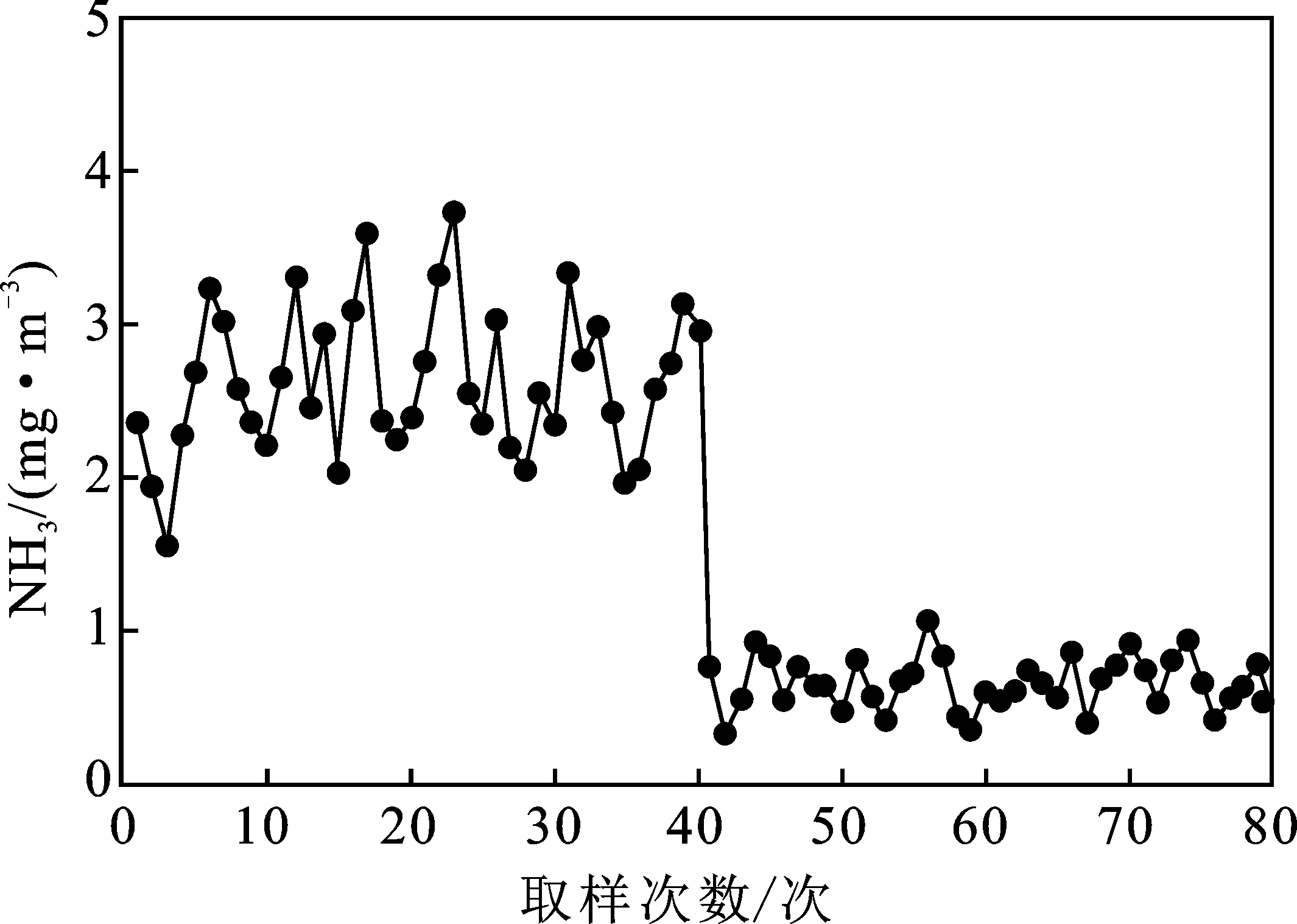在污水廠廠界外 1 m,東南西北方向各設(shè)置一個(gè)監(jiān)測(cè)點(diǎn),設(shè)備投入運(yùn)行后,在 2017 年 8 月進(jìn)行連續(xù) 3 天的監(jiān)測(cè),分別在 02: 00 ~ 03: 00、08: 00 ~09: 00、14: 00 ~ 15: 00、20: 00 ~ 21: 00 對(duì)各個(gè)監(jiān)測(cè)點(diǎn)進(jìn)行主要惡臭氣體硫化氫和氨的檢測(cè),結(jié)果見(jiàn)表2