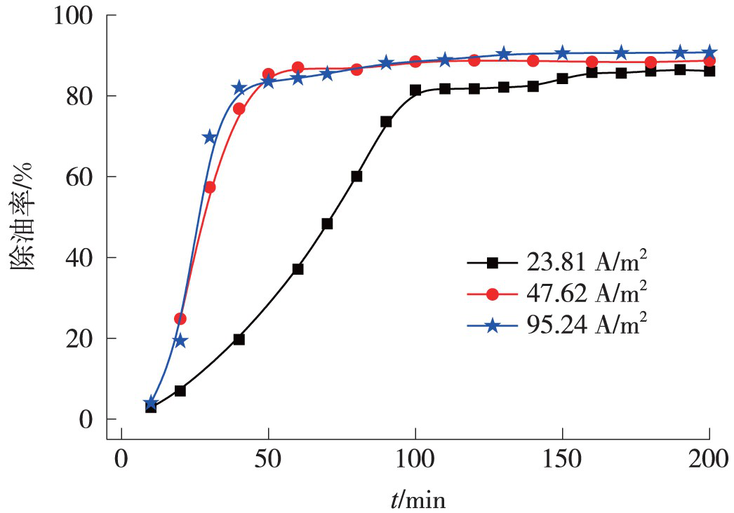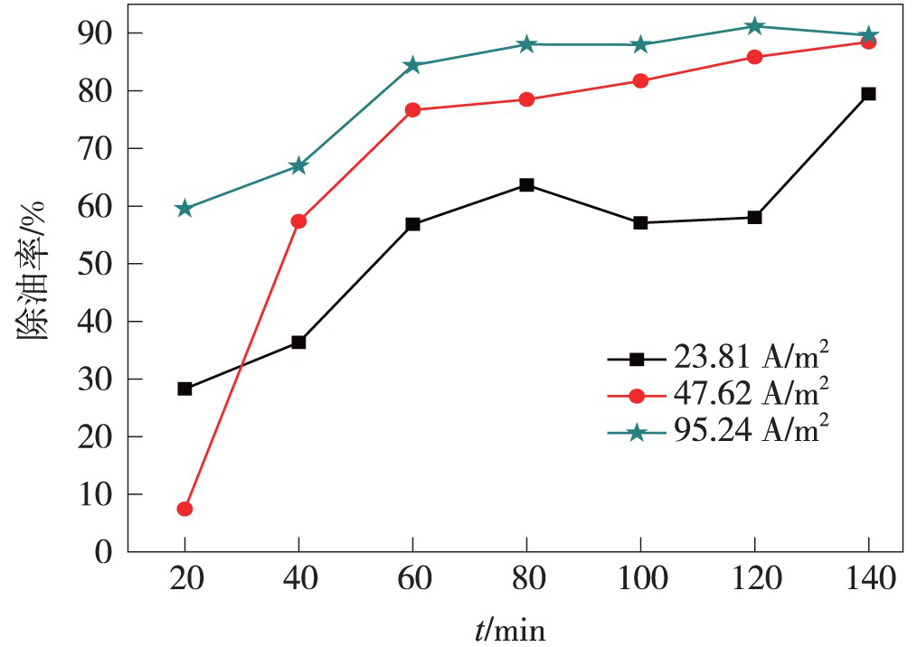 A/m2 時(shí),電解50 min 即可達(dá)到穩(wěn)態(tài);且電流密度越大,達(dá)穩(wěn)態(tài)時(shí)的處理效果越好,穩(wěn)態(tài)時(shí)除油率達(dá)