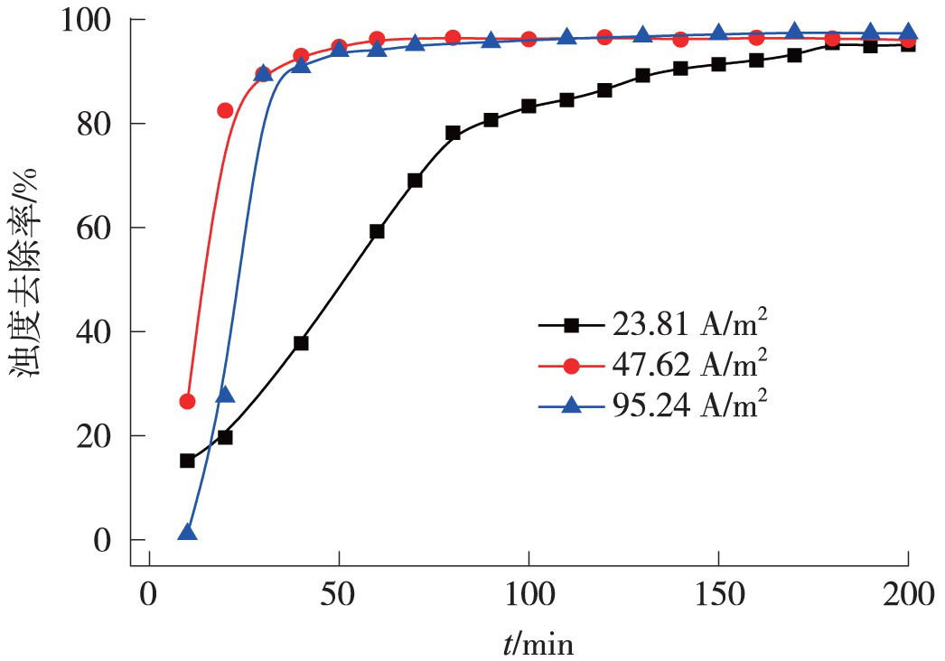 m2 時(shí)的處理效果,電流密度為47.62A/m2 時(shí)除油率顯著增加。當(dāng)電流密度增大到95.24A/m2 時(shí),電解前期除油率高于47.62A/m2 時(shí)的除油率,其余時(shí)間除油率基本持平。由圖13、圖14 可以看出,濁度去除率和固體懸浮物去除率隨著電流密度的升