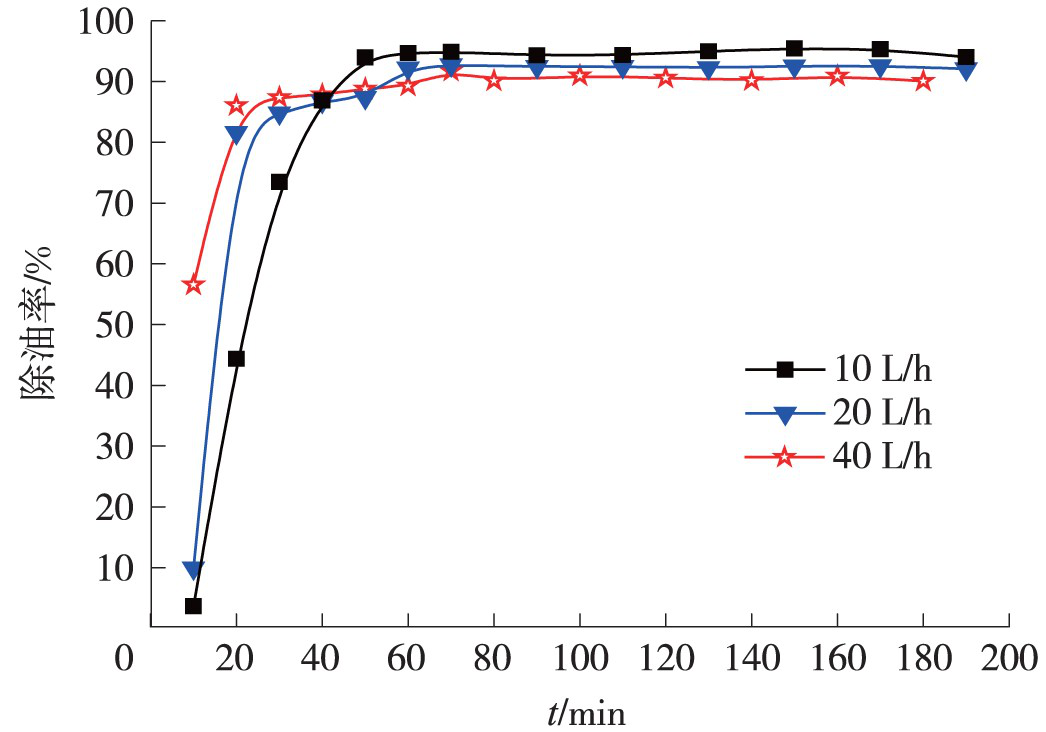 由圖6、圖7可以看出,除油率和濁度去除率隨處理流量的增大而減小,這是由于處理流量越大,含油污水在裝置內(nèi)的停留時(shí)間越短,反應(yīng)越不充分,處理效果越差。