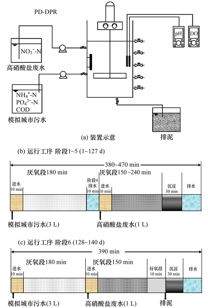 本研究采用厭氧-缺氧-微曝氣運(yùn)行的序批式活性污泥反應(yīng)器(SBR), 以模擬城市污水和高硝酸鹽廢水為處理對(duì)象, 通過聯(lián)合調(diào)控進(jìn)水C/N比、厭氧排水比和缺氧時(shí)間, 考察了PD-DPR耦合系統(tǒng)的啟動(dòng)和優(yōu)化運(yùn)行特性, 并探索了PD-DPR過程N(yùn)O2--N積累和PO43--P去除機(jī)制, 以期為PD-DPR耦合ANAMMOX實(shí)現(xiàn)城市污水和高硝酸鹽廢水的深度脫氮除磷提供實(shí)驗(yàn)數(shù)據(jù)支撐和理論支持.