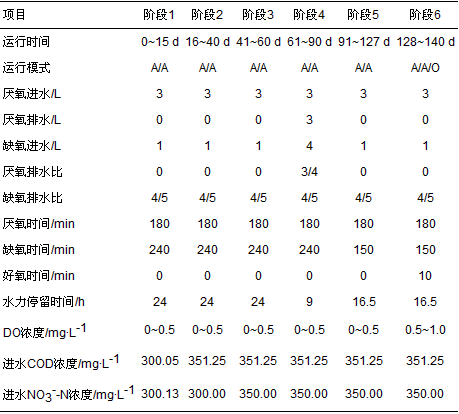 SBR先后采用厭氧-缺氧、厭氧-缺氧-微曝氣運(yùn)行方式, 共運(yùn)行140 d, 每天運(yùn)行2周期, 階段1~5(1~127 d), SBR以厭氧(180 min)-缺氧(150~240 min)的方式運(yùn)行, 以實(shí)現(xiàn)系統(tǒng)NO2--N的穩(wěn)定積累, 提高NTR; 階段6(128~140 d), SBR以厭氧(180 min)-缺氧(150 min)-微曝氣(10 min)的運(yùn)行方式, 主要實(shí)現(xiàn)系統(tǒng)對(duì)PO43--P的高效去除.此外, 在反應(yīng)運(yùn)行每個(gè)周期的厭氧段和缺氧段(前10 min), 分別向反應(yīng)器內(nèi)進(jìn)3 L人工模擬城市污水和1 L高硝酸鹽廢水.微曝氣段末期(10 min), 排泥0~20 mL, 以保證系統(tǒng)混合液懸浮固體濃度(MLSS)維持在(3 200±60)mg ·L-1, SBR運(yùn)行過程中運(yùn)行參數(shù)詳見表 1.