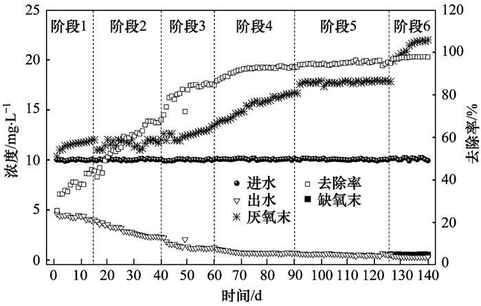 階段6(126~140 d), 當(dāng)系統(tǒng)以厭氧-缺氧-微曝氣模式運(yùn)行, 微曝氣段DO濃度控制在0.5~1.0 mg ·L-1時(shí), 厭氧末PO43--P濃度由19.89 mg ·L-1進(jìn)一步升高并穩(wěn)定在21.99 mg ·L-1, 缺氧末PO43--P濃度為0.52 mg ·L-1, 出水PO43--P濃度穩(wěn)定低于0.50 mg ·L-1.該結(jié)果表明增加微曝氣段, 有助于PAOs的進(jìn)一步吸磷, 其保障了系統(tǒng)高效穩(wěn)定的除磷性能.杜世明等采用厭氧-缺氧-微曝氣模式運(yùn)行DPR-SNED系統(tǒng), 并用于處理低C/N城市污水與硝酸鹽廢水時(shí), 同樣得出低DO條件(0.5~1.0 mg ·L-1)可以保障系統(tǒng)的高效除磷.