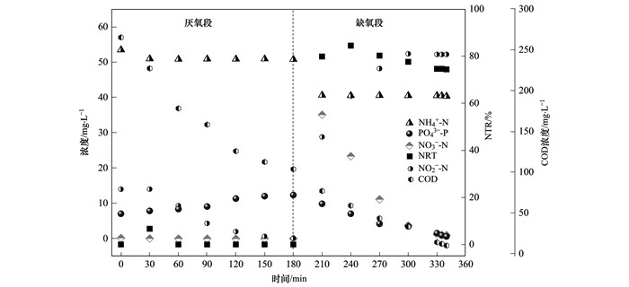 缺氧段(180~330 min), COD、NO3--N和PO43--P濃度均呈現(xiàn)降低趨勢(shì), 其分別降低至14.17、1.24和1.55 mg ·L-1, 同時(shí)NO2--N濃度升高至54.33 mg ·L-1.說明在缺氧段DOHOs發(fā)生外源短程反硝化的同時(shí), DPAOs進(jìn)行反硝化除磷, 以實(shí)現(xiàn)系統(tǒng)COD、NO3--N和PO43--P的去除和NO2--N的積累.此外, 值得注意的是COD的去除主要發(fā)生在180~270 min內(nèi)(降低39.58 mg ·L-1), 而在第270~330 min內(nèi)COD濃度降低相對(duì)較少(29.19 mg ·L-1).在該缺氧段COD變化量為68.87 mg ·L-1, 其小于NO3--N短程反硝化過程所需理論COD值(89.19 mg ·L-1), 證明了系統(tǒng)內(nèi)DGAOs的EPD過程的進(jìn)行.另外, NTR先由第180 min時(shí)的0逐漸升高至第240 min時(shí)的84%后又逐漸降低至第330 min時(shí)的75%.分析NTR先增后減的原因可能在于外源短程反硝化進(jìn)程較快, 可在前60 min內(nèi)消耗大量NO3--N并產(chǎn)生NO2--N; 而在后續(xù)90 min內(nèi), EPD和PDR過程進(jìn)行較慢, 其所產(chǎn)生NO2--N易被再次用于反硝化, 進(jìn)而造成NO2--N積累量和NTR的降低.