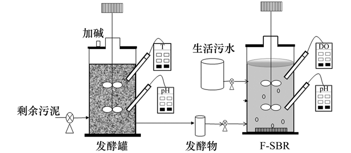 投加污泥發(fā)酵混合物作為碳源的BNR系統(tǒng)(F-SBR)如圖 1所示, 剩余污泥堿性發(fā)酵罐和F-SBR為兩個(gè)有效體積為10 L的SBR.剩余污泥堿性發(fā)酵罐為半連續(xù)式反應(yīng)器, 體積為10 L, 污泥停留時(shí)間SRT為6~8 d, pH控制在10±0.2, 溫度為30℃, 通過控制污泥發(fā)酵在水解酸化階段積累SCFAs, 根據(jù)SRT每周期排放剩余污泥發(fā)酵混合物至儲泥罐并加入等體積新鮮的剩余污泥.F-SBR利用污泥發(fā)酵混合物作為碳源, 每周期12 h, 采用厭氧-好氧-缺氧的運(yùn)行方式, 缺氧段投加污泥發(fā)酵混合物作為碳源進(jìn)行反硝化, 排水比為50%.反應(yīng)器內(nèi)裝有pH探頭和DO探頭, 好氧段維持溶解氧在1.5~2mg·L-1, 反應(yīng)器MLSS維持在(4 930±124) mg·L-1.