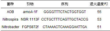 NH4+-N, NO2--N和NO3--N均采用國家規(guī)定的標(biāo)準(zhǔn)方法測定; pH值、DO和溫度采用Multi340i-WTW測定; MLSS、MLVSS采用重量法測定; SCFAS采用Agilent 6890N氣相色譜儀測定, 采用Agilent DB-WAXetr (30 m×0.53 mm×0.001 mm)色譜柱, 氮?dú)庾鲚d氣, 流速為20 mL·min-1, 檢測器為氫火焰檢測器(FID); 活性污泥系統(tǒng)中的AOB、NOB(nitrospira和nitrobactor)采用qPCR技術(shù)(SYBR Green法)進(jìn)行檢測, 采用土壤DNA快速試劑盒(MP Biomedaicals, OH, USA)對泥樣中的DNA進(jìn)行提取, 使用MX3000P實(shí)時(shí)定量PCR儀(Stratagene, La Jolla, CA)進(jìn)行測量, 利用不同特異性引物和擴(kuò)增程序進(jìn)行PCR測試, 具體各菌所用的特異性引物和退火溫度如表 2所示.