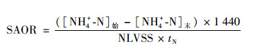 式中, [NH4+-N]始為硝化開始時(shí)反應(yīng)器內(nèi)的NH4+-N濃度(mg·L-1); [NH4+-N]末為硝化結(jié)束時(shí)反應(yīng)器內(nèi)的NH4+-N濃度(mg·L-1); MLVSS為反應(yīng)器內(nèi)的污泥質(zhì)量濃度(mg·L-1); tN為硝化反應(yīng)時(shí)間(min).