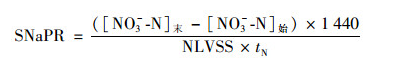 式中, [NO3--N]末為硝化結(jié)束后反應(yīng)器內(nèi)的NO3--N濃度(mg·L-1); [NO3--N]始為硝化開始時(shí)反應(yīng)器內(nèi)的NO3--N濃度(mg·L-1); MLVSS為反應(yīng)器內(nèi)的污泥質(zhì)量濃度(mg·L-1); tN為硝化反應(yīng)時(shí)間(min).