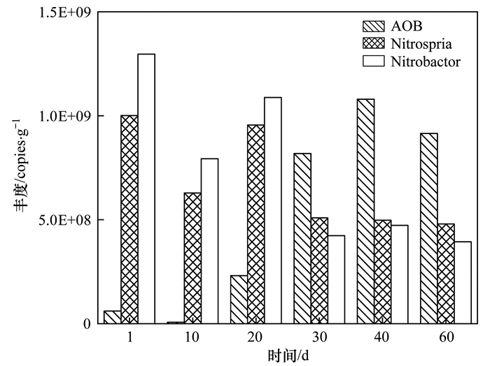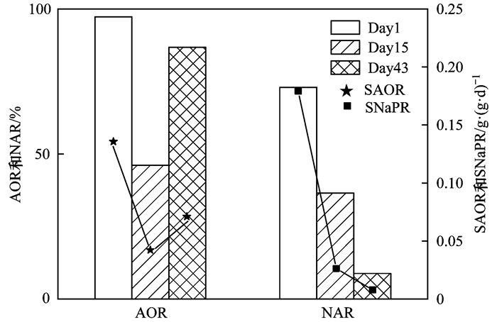 圖 2所示為硝化過程中添加剩余污泥堿性發(fā)酵混合物作為碳源的SBR反應(yīng)器(F-SBR)在長期運(yùn)行過程中好氧末氮轉(zhuǎn)化途徑, 系統(tǒng)在投加污泥發(fā)酵混合物作為碳源后, 硝化性能下降, 好氧末有NH4+-N剩余.在15 d后系統(tǒng)開始逐漸適應(yīng)污泥發(fā)酵混合物的投加, 硝化活性開始逐漸恢復(fù), 并且反應(yīng)器內(nèi)開始出現(xiàn)亞硝積累現(xiàn)象并維持穩(wěn)定, 穩(wěn)定后反應(yīng)器內(nèi)好氧末的平均亞硝積累率維持在87.4%.圖 3為反應(yīng)器初始階段(Day1)、恢復(fù)階段(Day15)與短程硝化穩(wěn)定維持階段(Day43)的AOB和NOB活性進(jìn)行對比, 可以發(fā)現(xiàn)AOB的活性已經(jīng)得到了一定的恢復(fù), NOB的活性則受到了明顯的抑制, 硝化過程中硝態(tài)氮積累率(NAR)由初始的73.03%降低至8.89%, 比硝態(tài)氮積累速率(SNaPR)由初始的0.179 1 g·(g·d)-1下降至0.007 8 g·(g·d)-1.圖 4為反應(yīng)器內(nèi)長期AOB和NOB種群豐度情況(以干污泥計(jì)), 反應(yīng)器內(nèi)投加污泥發(fā)酵物后AOB和NOB的豐度均呈現(xiàn)先下降后上升的趨勢, 反應(yīng)器在適應(yīng)污泥發(fā)酵物的投加后, AOB由6.08×107 copies·g-1增長至9.15×108 copies·g-1, 種群豐度上升; Nitrospria由1×109copies·g-1下降至4.79×108 copies·g-1, Nitrobacter由1.3×109 copies·g-1下降至3.94×108copies·g-1, NOB的基因拷貝數(shù)均下降一個(gè)數(shù)量級, 種群豐度下降.這也與反應(yīng)器內(nèi)的反應(yīng)情況吻合, 系統(tǒng)在適應(yīng)污泥發(fā)酵物的投加后AOB活性恢復(fù)且快速富集, 而NOB的活性則長期受到抑制, 種群豐度明顯下降.