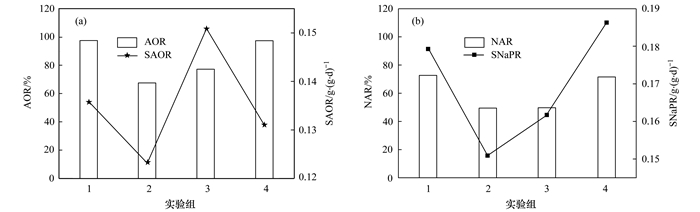 進(jìn)一步考察不同污泥發(fā)酵產(chǎn)物對活性污泥系統(tǒng)硝化性能的影響, 分別考察系統(tǒng)內(nèi)的氨氮氧化率、硝態(tài)氮積累率、比氨氧化速率、比硝態(tài)氮生成速率的變化情況(圖 6). 1組在未投加污泥發(fā)酵產(chǎn)物的情況下, 原始的AOR和SAOR(以N/VSS計(jì))分別為97.29%和0.135 7 g·(g·d)-1, NAR和SNaPR分別為73.03%和0.179 3 g·(g·d)-1, AOB和NOB活性良好. 2~4實(shí)驗(yàn)組污泥的AOR分別為67.34%、77.14%和97.26%, SAOR分別為0.123 6、0.151 0和0.131 0 g·(g·d)-1, 可以看出2組(投加發(fā)酵混合物)AOB的活性有所下降; 3組(投加發(fā)酵液)AOB的活性反而有所上升; 4組(投加發(fā)酵底泥)AOB的活性相較于原始污泥則沒有太大變化.污泥的NAR分別為49.47%、49.43%和71.34%, SNaPR分別為0.151 0、0.161 7和0.186 4 g·(g·d)-1, 可以看出2組(投加發(fā)酵混合物)和3組(投加發(fā)酵液)的實(shí)驗(yàn)組中, 硝態(tài)氮積累率和比硝態(tài)氮積累速率都有了明顯的下降, NOB的活性受到了抑制, 而4組(投加發(fā)酵底泥)比硝態(tài)氮積累速率反而有所上升, 證明NOB的活性相比于其他實(shí)驗(yàn)組有所提高.