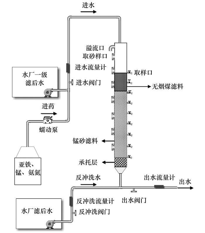 采用中試裝置在凈化車間開展低溫生物除鐵錳硝化耦合CANON工藝實驗研究.裝置采用已停止運行1個月的成熟生物濾柱.如圖 1所示, 由有機玻璃制成, 高為3 000 mm, 內徑為200 mm.濾柱采用裝填總高度為1 600 mm的雙層濾料, 上層400 mm為級配為1.0~1.2 mm的無煙煤成熟濾料, 下層1 200 mm為級配為0.6~1.2 mm的錳砂濾料, 承托層采用級配為1.2~20.0 mm的鵝卵石, 厚度為400 mm.