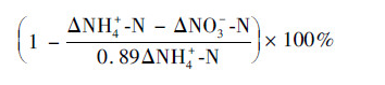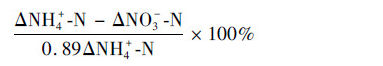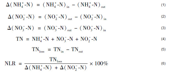 式中, Δ(NH4+-N):進出水氨氮變化量, (NH4+-N)in:進水氨氮量, (NH4+-N)out:出水氨氮量; Δ(NO2--N):進出水亞氮變化量, (NO2--N)out:出水亞氮量, (NO2--N)in:進水亞氮量; Δ(NO3--N):進出水硝氮變化量, (NO3--N)out:出水硝氮量, (NO3--N)in:進水硝氮量; TN:氮素總量, TNin:進水氮素總量, TNout:出水氮素總量, TNloss:進出水氮素損失, 上述參數的單位均為mg·L-1; NLR為氮素損失率(%).