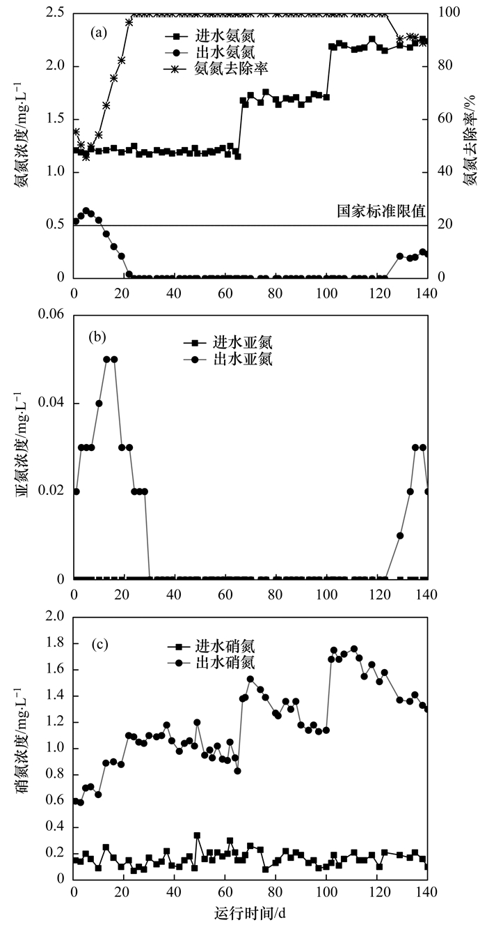 圖 3為運行過程中進出水“三氮”變化情況.由圖 3(a)知, 啟動初期濾后水氨氮濃度首先升高, 造成此現(xiàn)象的原因是濾料具有物理吸附作用, 然而其吸附位是有限的, 故隨著運行時間的延長, 濾料的吸附能力逐漸飽和, 濾柱對氨氮的吸附能力逐漸降低, 故濾柱在啟動初期出水氨氮濃度表現(xiàn)出增加的趨勢.由圖 3(b)知, 啟動的前30 d, 出水亞氮濃度高于進水, 表明濾柱中的AOB菌(氨氧化菌)活性或生物量強于NOB(亞硝酸鹽氧化菌)和AnAOB(厭氧氨氧化菌), 出水亞氮得到了積累.分析圖 3(c)可知, 在濾柱啟動初期, 出水硝氮濃度明顯高于進水硝氮濃度, 表明停運1個月的生物濾柱經過短時間培養(yǎng)后仍然具有較好的硝化性能, 隨著生物濾柱的培養(yǎng), 出水硝氮濃度逐漸升高.