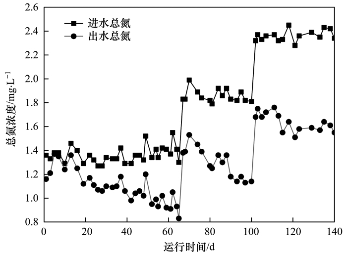 進出水“總氮”變化如圖 4所示.在啟動初期, 出水總氮濃度低于進水總氮濃度, 總氮濃度不守恒, 導致濾柱在啟動初期總氮濃度不守恒的主要原因是濾料通過物理吸附作用對水中的氨氮和硝氮進行了吸附, 導致水中的總氮濃度降低.隨著濾料物理吸附作用的逐漸飽和, 濾料吸附水中氨氮和硝氮的量逐漸降低, 而此時濾柱中AnAOB的活性和生物量并未完全恢復, 因此, 濾柱中的總氮損失逐漸降低.在濾料對氨氮吸附達到飽和的過程中, 更高負荷的氨氮進入濾層深處, 微生物能夠接觸到更多的氨氮, 提高了其對氨氮的網捕效率, 微生物與氨氮所處的動態(tài)平衡遭到破壞, 濾料表面AOB、NOB和AnAOB不斷富集, 微生物歷經第一活性增長期, 去除氨氮的生物效能逐漸增強.隨著AnAOB的生物量及生物活性的提高, ANAMMOX過程將逐漸建立, 總氮損失會進一步升高并趨于穩(wěn)定.