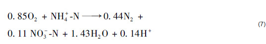 有研究表明, 當溶解氧一定時氨氮的CANON過程分為兩個步驟:①在生物膜外的好氧環(huán)境中, NH4+-N被AOB氧化成NO2--N; ②NH4+-N和上過程產生的NO2--N經過擴散作用進入到生物膜內的缺氧環(huán)境中, 在AnAOB的作用下兩者發(fā)生反應從而得到去除, 反應式如式(7)所示.