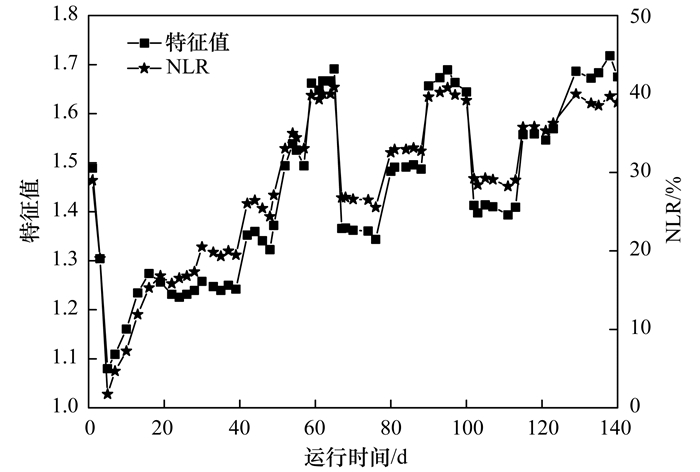 分析式(7)可知, 若氨氮全部經過CANON作用去除, 則濾柱中ΔNH4+-N與ΔNO3--N的理論比值應為8, 若1<ΔNH4+-N/ΔNO3--N<8且連續(xù)穩(wěn)定, 即表明成功啟動硝化耦合CANON工藝.圖 5為濾柱運行過程中NLR和特征值變化情況, 在啟動初期由于濾料的物理吸附作用, 導致濾柱中TNloss(氮素損失)較多, NLR較高.由圖 3(c)知, 濾柱在啟動初期就具有硝化能力, 出水中硝氮濃度大于進水硝氮濃度, 并且濾柱同樣可以吸附水中的硝氮, 因此ΔNH4+-N大于ΔNO3--N, 特征值>1.由于濾料的吸附位是有限的, 故隨著濾柱的運行, 濾料的吸附能力逐漸降低, 生物去除氨氮的能力增強, 所以NLR和特征值逐漸降低.隨著濾料吸附趨于飽和以及ANAMMOX過程的逐漸建立, NLR和特征值將逐漸升高并趨于穩(wěn)定.