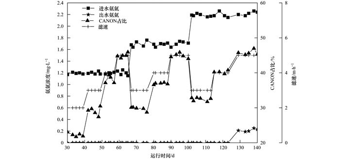 當生物濾柱運行至70 d時, 進水氨氮濃度為1.73 mg·L-1, 濾速為3 m·h-1, 出水氨氮濃度為0, 進出水亞氮濃度均為0, 進水硝氮濃度為0.26 mg·L-1, 出水硝氮濃度為1.53 mg·L-1, 故氨氮的去除量為1.73 mg·L-1, 硝氮變化量為1.27 mg·L-1, 氮素損失為0.46 mg·L-1, 由式(9)和(10)知, 經CANON過程去除的氨氮約為0.52 mg·L-1, 約占氨氮去除量的29.88%, 經硝化作用去除的氨氮約為1.21 mg·L-1, 約占氨氮去除量的70.12%.由圖 6可知, 當進水氨氮濃度平均為1.7 mg·L-1, 并以3 m·h-1的濾速運行時, 氨氮的平均去除量為1.7 mg·L-1, 經CANON過程去除的氨氮平均約占氨氮去除量的29.73%, 約為0.50 mg·L-1, 故經硝化作用去除的氨氮平均約占氨氮去除量的70.27%, 約為1.20 mg·L-1; 當濾速提升至4 m·h-1時, 氨氮的平均去除量為1.7 mg·L-1, CANON作用去除的氨氮平均約占氨氮去除量的35.99%, 約為0.61 mg·L-1, 故經硝化作用去除的氨氮平均約占氨氮去除量的64.01%, 約為1.09 mg·L-1; 繼續(xù)提升濾速至5 m·h-1, 氨氮的平均去除量仍為1.7 mg·L-1, 經CANON作用去除的氨氮平均約占氨氮去除量的44.89%, 約為0.76 mg·L-1, 故經硝化作用去除的氨氮平均約占氨氮去除量的55.11%, 約為0.94 mg·L-1.由此知, 當進水氨氮濃度平均為1.7 mg·L-1時, 提升濾速會導致通過CANON作用去除的氨氮及比例增加, 而通過硝化作用去除的氨氮及比例降低.