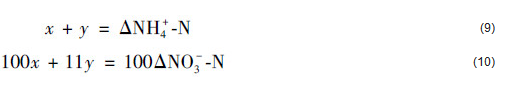 設硝化作用和CANON作用去除的氨氮分別為x和y, 則可得式(9)及式(10):