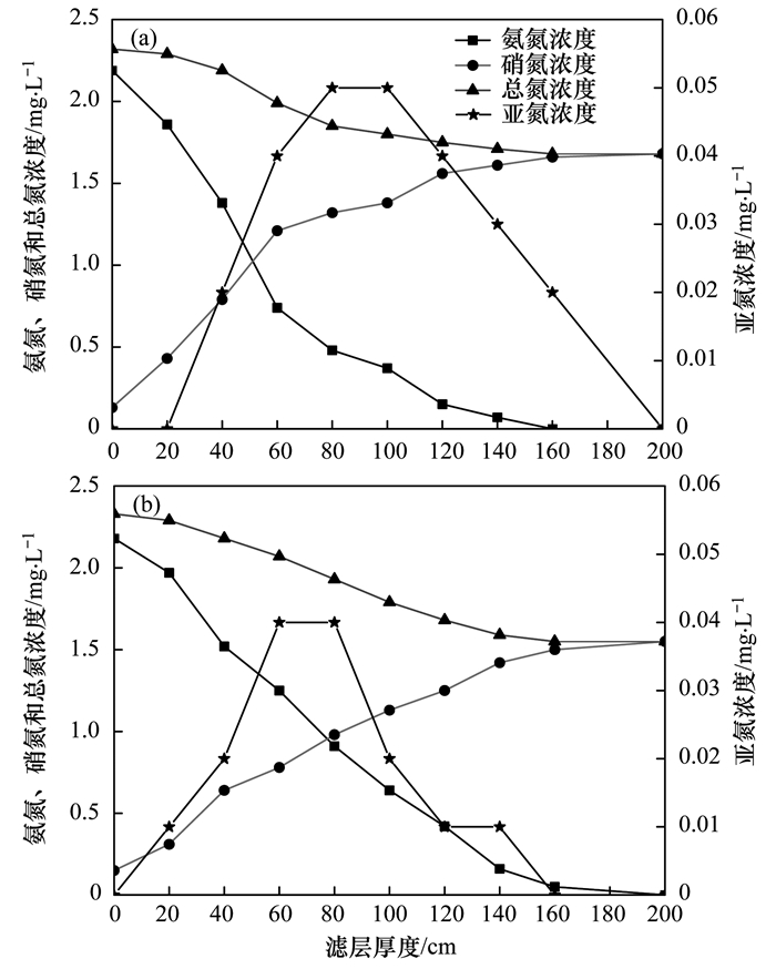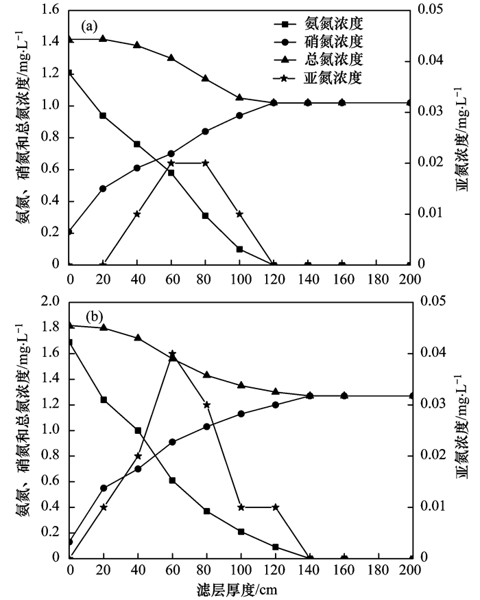 由圖 8(a)知, 當進水氨氮濃度為1.21 mg·L-1時, 濾柱中的氨氮至濾層120 cm處降低至0, 在濾層20 cm至120 cm范圍內的水中均有亞氮積累, 由總氮濃度沿程變化曲線知, 氮素損失主要發(fā)生在濾層的40~100 cm, 在濾層40~100 cm范圍內共存有亞氮和氨氮, 滿足CANON工藝的條件.而由圖 8(b)知, 當進水氨氮濃度提升至1.69 mg·L-1時, 濾柱中的氨氮需至濾層140 cm處降低至0, 對比57 d時進水氨氮濃度為1.21 mg·L-1可知, 進水氨氮濃度增加會導致氨氮去除區(qū)位向濾層深處位移, 此時在濾層前140 cm的水中均有亞氮積累, 同樣由總氮濃度沿程變化曲線知, 氮素損失主要發(fā)生在濾層的20~120 cm, 在濾層20~120 cm范圍內亦共存亞氮和氨氮, 同樣滿足CANON工藝所需的條件.由上文已知, 當進水氨氮濃度為1.21 mg·L-1時, 經CANON過程去除的氨氮約為0.45 mg·L-1, 而當進水氨氮濃度為1.69 mg·L-1時, 經CANON過程去除的氨氮增加至0.62 mg·L-1.相較于前者, 后者經CANON過程去除的氨氮增加的原因亦可以由兩者的氨氮濃度沿程變化曲線進行說明:由氨氮濃度沿程變化曲線和亞氮濃度沿程變化曲線知, 濾柱在57 d以進水氨氮濃度為1.21 mg·L-1運行時在氨氮和亞氮共存區(qū)域中的氨氮濃度要小于濾柱在80 d以進水氨氮濃度為1.69 mg·L-1運行時在氨氮和亞氮共存區(qū)域中的氨氮濃度, 故后者濾層中CANON過程第二步所處的氨氮濃度升高, 提高了濾層中AnAOB對氨氮離子的網捕效率, 微生物與氨氮濃度所處的動態(tài)平衡遭到破壞, 歷經第一活性增長期, 濾層的ANAMMOX性能增強.因此保持濾速不變, 提升進水氨氮濃度會導致通過CANON作用去除的氨氮增加.