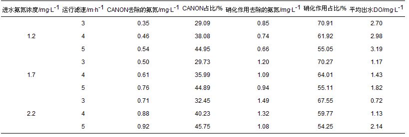 在該生物濾柱中當進水氨氮濃度平均分別為1.2 mg·L-1和1.7 mg·L-1時, 平均進水DO濃度約為8.3 mg·L-1, 當進水氨氮濃度平均為2.2 mg·L-1時, 平均進水DO濃度調整為約10.0 mg·L-1.由表 2及圖 6分析知, 當濾柱均以3 m·h-1運行, 平均進水氨氮濃度為1.2 mg·L-1時, 平均的去除氨氮量為1.2 mg·L-1, 平均出水DO濃度約為2.70 mg·L-1, 經CANON過程去除的氨氮約為0.35 mg·L-1, 約占氨氮去除量的29.09%, 經硝化作用去除的氨氮約為0.85 mg·L-1, 約占氨氮去除量的70.91%;當平均進水氨氮濃度為1.7 mg·L-1時, 平均的氨氮去除量為1.7 mg·L-1, 平均出水DO濃度約為1.17 mg·L-1, CANON作用去除的氨氮約為0.5 mg·L-1, 約占氨氮去除量的29.73%, 硝化作用去除的氨氮約為1.20 mg·L-1, 約占氨氮去除量的70.27%;當平均進水氨氮濃度為2.2 mg·L-1, 此時平均的氨氮去除量為2.2 mg·L-1, 平均出水DO濃度約為0.72 mg·L-1, 經CANON過程去除的氨氮約為0.71 mg·L-1, 約占氨氮去除量的32.45%, 經硝化作用去除的氨氮約為1.49 mg·L-1, 約占氨氮去除量的67.55%.當濾柱均以4 m·h-1運行, 進水氨氮濃度平均為1.2 mg·L-1時, 氨氮的平均去除量為1.2 mg·L-1, 平均出水DO濃度約為2.98 mg·L-1, 經CANON過程去除的氨氮約為0.46 mg·L-1, 約占氨氮去除量的38.08%, 經硝化作用去除的氨氮約為0.74 mg·L-1, 約占氨氮去除量的61.92%;當進水氨氮濃度平均為1.7 mg·L-1時, 氨氮的平均去除量為1.7 mg·L-1, 平均出水DO濃度約為1.43 mg·L-1, 經CANON過程去除的氨氮約為0.61 mg·L-1, 約占氨氮去除量的35.99%, 經硝化作用去除的氨氮約為1.09 mg·L-1, 約占氨氮去除量的64.01%;當進水氨氮濃度平均為2.2 mg·L-1時, 氨氮的平均去除量為2.2 mg·L-1, 平均出水DO濃度約為1.13 mg·L-1, 經CANON過程去除的氨氮約為0.88 mg·L-1, 約占氨氮去除量的40.23%, 經硝化作用去除的氨氮約為1.32 mg·L-1, 約占氨氮去除量的59.77%.當濾柱均以5 m·h-1運行, 進水氨氮濃度平均為1.2 mg·L-1時, 氨氮的平均去除量為1.2 mg·L-1, 平均出水DO濃度約為3.19 mg·L-1, 經CANON過程去除的氨氮約為0.54 mg·L-1, 約占氨氮去除量的44.95%, 經硝化作用去除的氨氮約為0.66 mg·L-1, 約占氨氮去除量的55.05%;當平均進水氨氮濃度為1.7 mg·L-1時, 平均去除的氨氮為1.7 mg·L-1, 出水DO濃度平均約為1.82 mg·L-1, CANON過程去除的氨氮約為0.76 mg·L-1, 約占氨氮去除量的44.89%, 硝化作用去除的氨氮約為0.94 mg·L-1, 約占氨氮去除量的55.11%;當平均進水氨氮濃度為2.2 mg·L-1時, 平均的氨氮去除量降至約2.0 mg·L-1, 平均出水DO濃度約為2.14 mg·L-1, 經CANON過程去除的氨氮約為0.92 mg·L-1, 約占氨氮去除量的45.75%, 經硝化作用去除的氨氮約為1.08 mg·L-1, 約占氨氮去除量的54.25%.故由上述知, 當濾速保持不變, 適度提升進水氨氮濃度, 會導致通過CANON作用去除的氨氮增加.為進一步明確水質對氨氮去除的影響, 筆者將以運行濾速均為4 m·h-1, 平均進水氨氮濃度分別為1.2和1.69 mg·L-1為例進行分析.