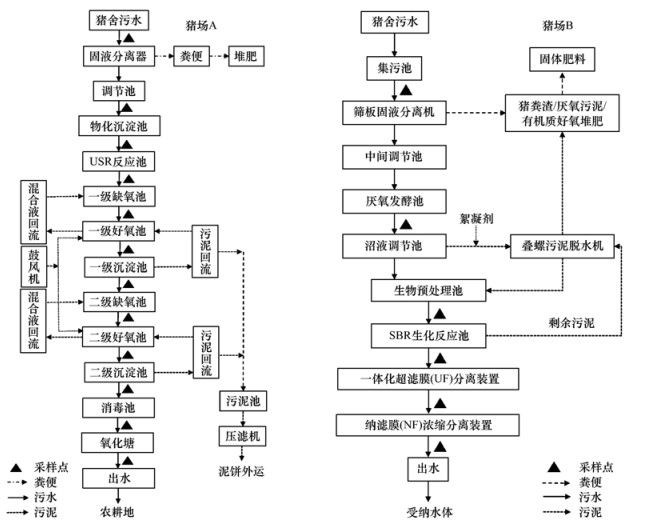 選取2種不同處理工藝的規(guī)模化養(yǎng)豬場(豬場A和豬場B)為研究對象. 2家養(yǎng)豬場的存欄量均為5 000頭(母豬), 場內(nèi)配備有廢水處理設施, 處理規(guī)模均為200 m3 ·d-1. 2019年4月對這2家養(yǎng)豬場按廢水處理工藝流程采集樣品, 豬場A的處理工藝為“固液分離+物化沉淀+USR(升流式固體厭氧反應器)+2級A/O+消毒池+氧化塘”, 出水最終排向周邊農(nóng)耕地;豬場B的處理工藝為“厭氧發(fā)酵+SBR生化+超濾(UF)+納濾(NF)”, 出水最終排向周邊水體.豬場A共采集12個樣品, 豬場B共采集6個樣品, 具體采樣點如圖 1所示.每個采樣點分別采集2次并混合均勻, 每次采集1.0 L, 共采集2.0 L.所有采集水樣均為瞬時水樣, 使用有機玻璃采水器采集表層水樣, 儲存在預先洗凈的采樣瓶中, 低溫避光保存, 并盡快運回實驗室, 保存在4℃的冰箱內(nèi)待測.