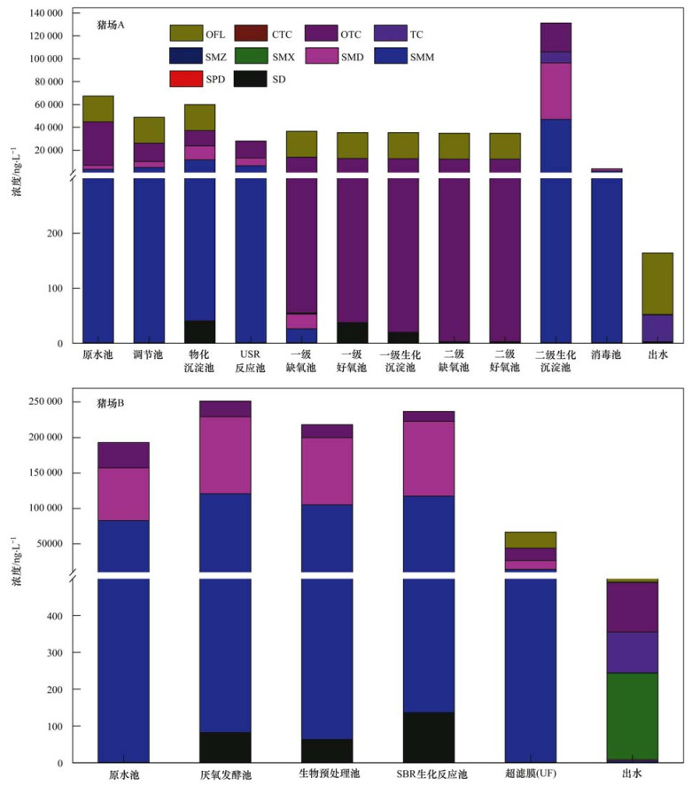 在2家豬場廢水處理工段中, SPD、SMX、SMZ和CTC均未被檢出, 而SMZ和CTC在陳永山等[24]的研究中均被檢出, 這可能是由于不同地區(qū)養(yǎng)殖場對獸用抗生素的利用模式差異所致.同時發(fā)現(xiàn)在2家養(yǎng)豬場廢水中OTC的檢出濃度均較高, 這與其它地區(qū)養(yǎng)豬場和養(yǎng)牛場廢水中OTC的殘留情況相似, 表明OTC為大部分養(yǎng)殖場所熱衷使用的抗生素.