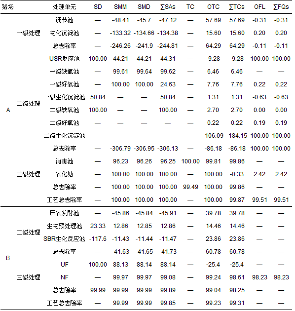養(yǎng)豬場廢水處理單元中抗生素的去除情況如表 3所示.在豬場廢水處理工藝的一級處理過程中, 豬場A對∑SAs、∑TCs和∑FQs的去除率分別為-244.81%、64.29%和-0.11%.其中對SMM、SMD和OFL的去除均出現(xiàn)負遷移現(xiàn)象(除在物化沉淀池對OFL的去除為正外), 這可能是由于廢水中細小的糞便或顆粒包裹進水中部分抗生素(SMM、SMD和OFL), 在處理單元中被微生物破壞了抗生素與糞便或顆粒之間的屏障, 從而增加該處理單元中SMM、SMD和OFL的濃度.而對OTC的去除均為正向去除, 其中在調(diào)節(jié)池中的去除率較高, 為57.69%, 這可能是因為在調(diào)節(jié)池處理單元時, OTC的去除除通過污泥吸附外, 還可能通過光降解、水解等途徑進行降解.