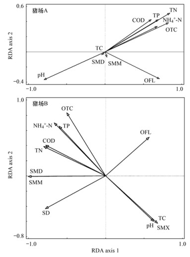 采用冗余分析(RDA)分析了2家規(guī);B(yǎng)豬場廢水的常規(guī)指標(COD、NH4+-N、TN、TP和pH)與廢水中抗生素之間的關(guān)系, 結(jié)果如圖 3所示.豬場A和豬場B的廢水中常規(guī)參數(shù)與抗生素在第1軸、第2軸的解釋量分別為79.10%、19.17%和97.04%、2.11%, 累計解釋量分別為98.27%和99.15%, 由此可見前兩軸能夠很好地反映廢水常規(guī)指標與抗生素之間的關(guān)系, 且主要由第1軸決定.在豬場A中, pH與TC、SMD和SMM呈正相關(guān), 與OFL和OTC呈負相關(guān);COD、NH4+-N、TN和TP與OTC和OFL呈正相關(guān), 與TC、SMD和SMM呈負相關(guān).在豬場B中, pH與TC和SMX呈正相關(guān), 與SMD、SMM、SD和OTC呈負相關(guān);COD、NH4+-N、TN和TP與SMD、SMM和OTC呈正相關(guān), 與OFL、TC和SMX呈負相關(guān).綜上, 表明廢水中常規(guī)指標(COD、NH4+-N、TN、TP和pH)與抗生素的降解具有相關(guān)性, 其中NH4+-N與OTC、pH與TC具有較大的正相關(guān)性, COD、NH4+-N、TN和TP與TC呈負相關(guān)性, pH與OTC呈負相關(guān)性, 這可能意味著部分抗生素會隨著微生物對有機物的生物降解而降解.但是, 在各處理單元中抗生素的去除機制還有待進一步研究.