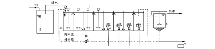 1.進(jìn)水閥; 2.進(jìn)水箱; 3.攪拌器; 4.曝氣孔; 5.蠕動(dòng)泵; 6.二沉池; 7.曝氣泵
