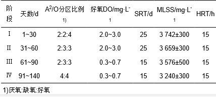整個(gè)試驗(yàn)過程中, 進(jìn)水流量為6 L·h-1, 實(shí)驗(yàn)室溫度在22℃左右, 內(nèi)回流比為2, 外回流比為1, 每個(gè)試驗(yàn)階段的具體工況參數(shù)如表 1所示.