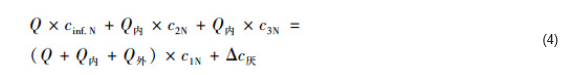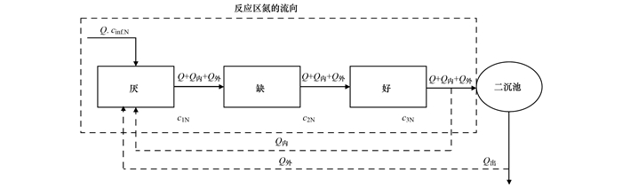 系統(tǒng)中氮污染物質(zhì)平衡如圖 2所示, 根據(jù)公式(4)可計(jì)算出厭氧、缺氧和好氧區(qū)的氮污染物質(zhì)平衡, 式中c1N、c2N和c3N分別為厭氧區(qū)末端、缺氧區(qū)末端和好氧區(qū)末端污染物濃度.