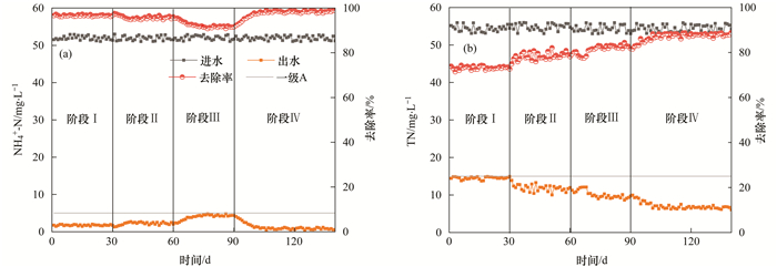 系統(tǒng)運(yùn)行過程中NH4+-N和TN的去除情況如圖 3所示.由圖 3(a)可以看出, 各階段NH4+-N的平均出水濃度分別為1.75、2.20、3.97和1.20mg·L-1, 平均去除率為96.64%、95.77%、92.36%和97.69%, 各階段出水NH4+-N的平均濃度均能滿足一級(jí)A標(biāo)準(zhǔn)水質(zhì)限值.系統(tǒng)較好的硝化作用與階段Ⅰ和Ⅱ好氧區(qū)中充足的DO濃度(2~3mg·L-1)以及階段Ⅳ好氧區(qū)中充足的HRT(7.5 h)直接相關(guān), 這與榮懿等研究結(jié)果相符, 其研究表明A2/O系統(tǒng)好氧區(qū)DO濃度為2~3mg·L-1、HRT為5.25 h時(shí), 好氧區(qū)硝化作用可達(dá)最佳狀態(tài), NH4+-N去除率高達(dá)95.30%~97.32%, 出水NH4+-N濃度為1.15~1.85 mg·L-1.階段Ⅲ系統(tǒng)硝化效果不佳的主要原因是好氧區(qū)DO濃度低(0.3~0.7mg·L-1), 且好氧區(qū)HRT不足(5.6 h).由圖 3(b)可以看出, 系統(tǒng)運(yùn)行過程中TN的去除效率呈遞增趨勢(shì), 各階段平均出水TN濃度分別為14.55、11.86、10.11和7.03mg·L-1, 平均去除率為73.22%、78.37%、81.34%和87.83%.
