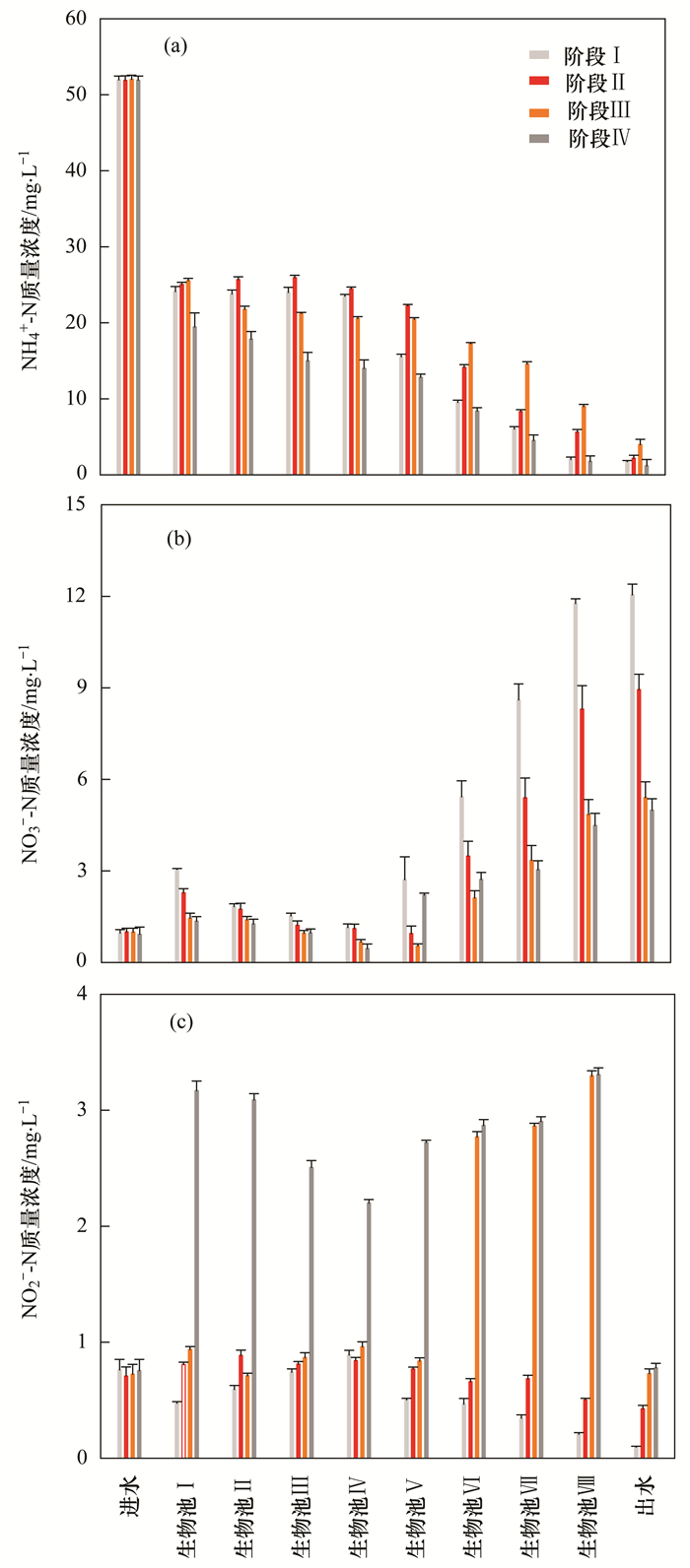 系統(tǒng)運(yùn)行過程中氮類污染物的沿程變化如圖 4所示.經(jīng)物料衡算分析可以得出, 除了系統(tǒng)的稀釋作用外, 各階段NH4+-N主要是在生物池Ⅳ~Ⅷ(好氧區(qū))中通過硝化作用去除, 好氧區(qū)對(duì)NH4+-N的去除率分別為86.98%、60.31%、47.86%和86.17%, 除了階段Ⅲ以外, 各階段好氧區(qū)均具有較高的NH4+-N去除效率.與階段Ⅰ和Ⅱ相比, 階段Ⅳ在降低好氧區(qū)DO濃度并提高好氧區(qū)分區(qū)比例的工況下, 仍能保證好氧區(qū)對(duì)NH4+-N的高效去除.然而階段Ⅰ~Ⅳ厭氧和缺氧區(qū)對(duì)NH4+-N的去除情況卻有著明顯的差異, 經(jīng)物料衡算分析可以得出, 各階段厭缺區(qū)域NH4+-N的去除率分別3.3%、11.78%、18.56%和28.06%, 可以看出系統(tǒng)運(yùn)行過程中, 厭氧和缺氧區(qū)對(duì)NH4+-N的去除效率呈現(xiàn)出明顯的增長趨勢(shì).與階段Ⅰ~Ⅲ相比, 階段Ⅳ缺氧區(qū)對(duì)NH4+-N的去除率已高達(dá)28.06%, 推測(cè)此時(shí)缺氧區(qū)已發(fā)生一定程度的厭氧氨氧化現(xiàn)象, 這是階段Ⅳ高效脫氮的主要原因.由圖 4(b)可以看出, NO3--N主要是在缺氧區(qū)中通過反硝化作用去除, 經(jīng)物料衡算分析可以得出, 缺氧區(qū)在階段Ⅰ~Ⅳ對(duì)NO3--N的去除效率分別為62.51%、58.37%、62.77%和66.69%, 各階段下缺氧區(qū)對(duì)NO3--N的去除情況無明顯差異, 然而好氧區(qū)在階段Ⅰ~Ⅳ對(duì)NO3--N的生成情況卻有著明顯的降低趨勢(shì)(334.19%、137.97%、129.45%和103.01%), 階段Ⅳ好氧區(qū)NO3--N的轉(zhuǎn)化率僅為103.01%, 這與階段Ⅳ好氧區(qū)高效的NH4+-N去除率相矛盾, 因此推測(cè)此時(shí)系統(tǒng)好氧區(qū)已發(fā)生一定程度的短程硝化現(xiàn)象.由圖 4(c)可以看出, 階段Ⅰ和Ⅱ系統(tǒng)沿程N(yùn)O2--N濃度幾乎無明顯變化, 然而在階段Ⅲ和Ⅳ系統(tǒng)好氧區(qū)內(nèi)已發(fā)生了明顯的NO2--N積累, 各階段好氧末端NO2--N的濃度分別為0.21、0.50、3.30和3.31 mg·L-1.