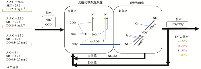針對(duì)污水處理的主流A2/O工藝, 課題組在短程硝化方面已做了相關(guān)研究, 比如吳春雷等通過調(diào)控分區(qū)比例和DO濃度構(gòu)建的短程硝化系統(tǒng), 當(dāng)該系統(tǒng)好氧區(qū)DO濃度為0.5~0.8mg·L-1, V缺:V好為1:1時(shí), 系統(tǒng)中AOB得到富集、NOB被淘洗, 好氧區(qū)末端的NO2--N濃度為4.8mg·L-1, NAR可達(dá)62%以上, 出水TN可降至9.0 mg·L-1, 能實(shí)現(xiàn)深度脫氮的目標(biāo).基于上述研究基礎(chǔ), 本文擬通過調(diào)控A2/O系統(tǒng)的曝氣分區(qū)比例、DO濃度和SRT進(jìn)一步構(gòu)建短程硝化耦合厭氧氨氧化系統(tǒng), 并對(duì)系統(tǒng)的脫氮性能、脫氮途徑以及微生物種群結(jié)構(gòu)進(jìn)行長期監(jiān)測(cè)和研究, 以期為A2/O城鎮(zhèn)污水處理廠的提標(biāo)改造和運(yùn)行調(diào)控提供新思路.