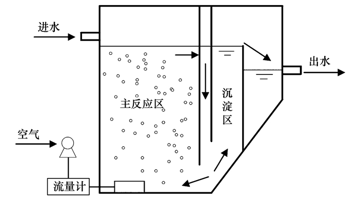 本實驗所用裝置為合建式連續(xù)流CSTR反應(yīng)器, 如圖 1所示, 由有機玻璃制成, 分曝氣區(qū)和沉淀區(qū)兩部分, 有效容積分別為1.7 L和0.6 L.曝氣區(qū)底部裝有曝氣裝置, 控制曝氣量為0.6 L·min-1(表面上升流速0.156 cm·s-1), 為污泥系統(tǒng)提供溶解氧和剪切力.反應(yīng)器置于恒溫水浴箱中, 溫度控制在28℃左右.