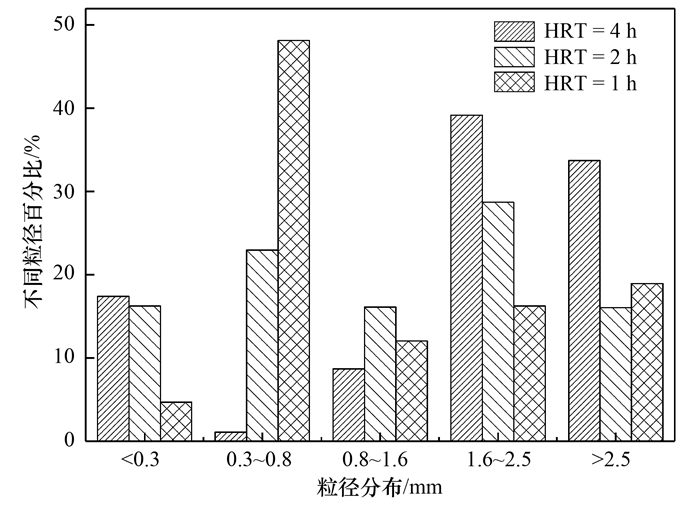 (1) HRT從4 h縮短至1 h, CSTR中顆粒污泥粒徑分布發(fā)生顯著變化.隨著HRT縮短, 粒徑 < 0.3 mm和粒徑>1.6 mm顆粒的質(zhì)量分?jǐn)?shù)分別由17%和75%逐漸下降至5%和36%, HRT為1 h時, 粒徑為0.3~0.8 mm顆粒占比約達50%.