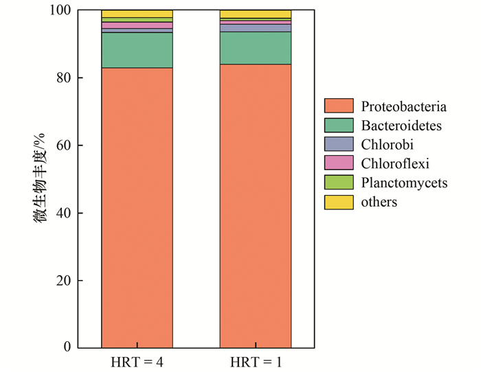 圖 6為CSTR系統(tǒng)在HRT為4 h和1 h穩(wěn)定運行條件下, 污泥測序在門水平下微生物群落多樣性分析結(jié)果, 主要包括變形菌門(Proteobacteria)、擬桿菌門(Bacteroidetes)、綠菌門(Chlorobi)、綠彎菌門(Chloroflexi)、浮霉菌門(Planctomycets).涉及到脫氮功能微生物的變形菌門占絕對優(yōu)勢, 超80%.HRT從4 h縮短至1 h, 變形菌門比例略有升高.系統(tǒng)中出現(xiàn)厭氧氨氧化菌所在的浮霉菌門, HRT縮短后, 這類微生物的比例略有下降.