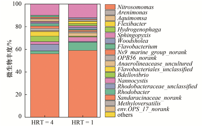 為了進一步闡明HRT對CSRT污泥微生物種群變化影響, 對屬水平樣品功能微生物和優(yōu)勢微生物菌群進行分析.如圖 7所示, 亞硝化單胞菌屬(Nitrosomomas)在CSTR污泥微生物群落中占絕對優(yōu)勢.亞硝化單胞菌屬(Nitrosomomas)是典型的AOB, 在本系統(tǒng)污泥中富集度高達56%以上.短程硝化技術(shù)實現(xiàn)的關(guān)鍵在于亞硝酸鹽的積累, 也就是通過富集污泥中的AOB, 并控制AOB和NOB的數(shù)量與活性平衡, 在硝化過程中實現(xiàn)亞硝酸鹽的穩(wěn)定積累.高通量微生物測序結(jié)果表明, 優(yōu)勢微生物Nitrosomomos的高度富集度, 也進一步解釋系統(tǒng)具有良好的氨氧化性能和亞硝酸鹽積累率.縮短HRT, Nitrosomomos豐度提高3%左右, 與系統(tǒng)脫氮性能提升結(jié)果吻合.盡管維持容積負荷不變, HRT從4 h到1 h, AOB絕對優(yōu)勢不變, 微生物門類一致, 但微生物種類和豐度發(fā)生變化, 有利于顆粒污泥中微生物的自平衡, 提升污泥自適應(yīng)性能.