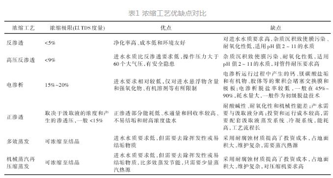 目前市場上出現(xiàn)的濃縮減量工藝有反滲透、高壓反滲透(碟盤式和卷式)、電滲析、多效蒸發(fā)、正滲透、機械蒸汽再壓縮蒸發(fā)等,不同濃縮工藝都有各自的濃縮極限和優(yōu)缺點,具體見表1。表1中TDS(Total Dissolved Solids)表示總?cè)芙夤腆w。