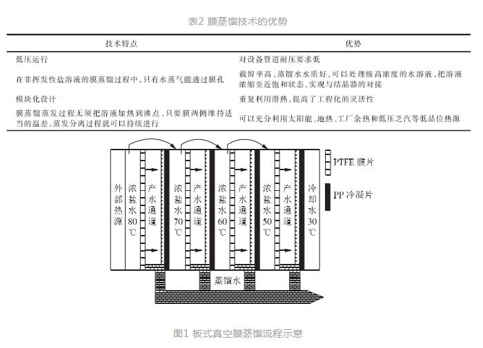 膜蒸餾技術(shù)是 20 世紀 60 年代出現(xiàn)的分離技術(shù),采用疏水微孔膜把液態(tài)和氣態(tài)兩相隔離開,以膜兩側(cè)由溫度引起的飽和蒸汽壓力差作為傳質(zhì)驅(qū)動力,只要膜兩側(cè)有溫度差,此分離過程就可持續(xù)進行。膜蒸餾技術(shù)具有其獨特的優(yōu)勢(見表 2),所以一直受到廣泛關(guān)注。常見的膜蒸餾過程有直接接觸式膜蒸餾、氣隙式膜蒸餾、減壓膜蒸餾、氣掃式膜蒸餾等,膜組件類型有板式、中空纖維式、管式及卷式。但目前市場上已經(jīng)通過大量中試并已成功工業(yè)化應用的膜蒸餾技術(shù)是板式真空多效膜蒸餾技術(shù)。