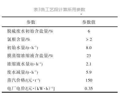 在經(jīng)過膜蒸餾的濃縮減量之后,進入結(jié)晶或噴霧干燥終端處理的濃縮液的量大大降低,那么終端處理設備的投資和運行成本也會隨之降低。以某發(fā)電集團下屬一燃煤電廠的 8 t/h 脫硫廢水為例,采用 綜 合 初 步 經(jīng) 濟 分 析 與 設 計 法(integratedPreliminary Economic Analysis and Design,iPEAD)[7]進行初步技術(shù)經(jīng)濟分析。各工藝段計算所用參數(shù)見表 3,用于技術(shù)經(jīng)濟分析計算的設備投資價格和運行成本見表 4。由于缺乏針對脫硫廢水的耐腐蝕金屬蒸發(fā)設備準確的成套投資價格,所以本文根據(jù)耐腐蝕金屬蒸發(fā)設備國內(nèi)外市場均價[8-9]及參考已建電廠以蒸發(fā)結(jié)晶為主工藝的脫硫廢水零排工程的設備投資(見表 5,表中:MED 為多效蒸發(fā);MVC為機械式蒸汽壓縮)來估算用于此經(jīng)濟分析中的耐腐蝕金屬蒸發(fā)設備的投資價格,此價格僅供參考,實際價格可能會高于此估算價格。由于脫硫廢水初始含鹽量已達 6%,并且氯根含量高于 2%,所以采用不同的蒸發(fā)+結(jié)晶或噴霧干燥的零排工藝進行對比,計算結(jié)果見表 6。