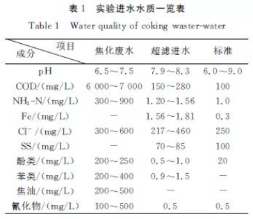 實(shí)驗(yàn)采用超濾-納濾膜組合工藝,對唐山某焦化廠二沉池出水進(jìn)行深度處理,該廠焦化廢水、二沉池出水(實(shí)驗(yàn)進(jìn)水)和排放標(biāo)準(zhǔn)見表1.