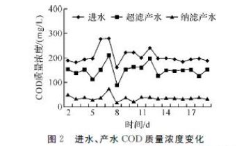 實(shí)驗(yàn)期間進(jìn)、出水COD的濃度變化情況見圖2.由圖2可知,進(jìn)水水質(zhì)波動(dòng)很大,COD在180~240mg/L,超濾產(chǎn)水水質(zhì)隨著進(jìn)水的變化而變化,而納濾產(chǎn)水水質(zhì)穩(wěn)定,COD維持在30~50mg/L左右,COD去除率為80%~90%.