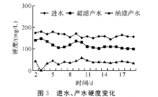 實(shí)驗(yàn)期間進(jìn)、產(chǎn)水的硬度變化情況見圖3.由圖3可知,實(shí)驗(yàn)進(jìn)水總硬度為150~180mg/L,超濾產(chǎn)水總硬度為100~150mg/L,而納濾產(chǎn)水硬度維持在40~50mg/L左右,實(shí)驗(yàn)對硬度的去除率為70%~75%.