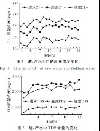實(shí)驗(yàn)期間Cl-的質(zhì)量濃度變化情況見圖4.由圖4可知,進(jìn)水Cl-質(zhì)量濃度為340~450mg/L,超濾產(chǎn)水Cl-質(zhì)量濃度為250~360mg/L,納濾產(chǎn)水Cl-質(zhì)量濃度為170~250mg/L,Cl-去除率為40%~50%.