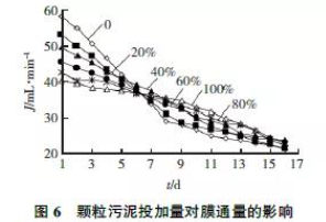 如圖6 所示,無顆粒污泥時(shí),運(yùn)行后膜通量由58 降到21. 3 mL /min,膜外表面凝膠層形成較快,膜通量迅速下降。后期由于凝膠層形成基本穩(wěn)定,通水量下降有所減少,膜通量衰減率為63. 3%。投入顆粒污泥后膜通量的衰減率逐漸減低,顆粒污泥質(zhì)量分?jǐn)?shù)為100%時(shí)膜通量衰減率降低到42. 8%,運(yùn)行開始時(shí)由于形成的凝膠層空隙率大,使得傳質(zhì)阻力較小,膜通量下降較慢。后期由于傳質(zhì)壓力使得凝膠層逐漸致密,阻礙傳質(zhì),使膜通量下降速度相對升高,但已經(jīng)很好的緩解了膜污染現(xiàn)象。