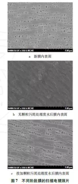 為了直觀的觀測膜污染情況,描電鏡觀察新膜內(nèi)表面、無顆粒污泥與投加顆粒污泥在運(yùn)行周期結(jié)束后的膜表面,見圖7。
