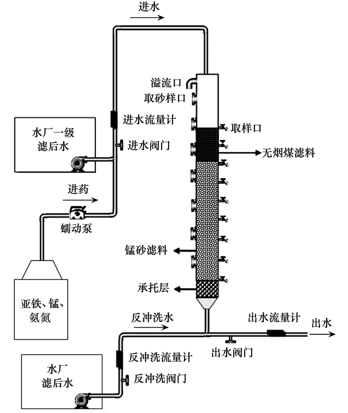 由上述研究分析可知, 在鐵錳氨凈化工藝中氨氮的去除途徑可能與進(jìn)水水質(zhì)有關(guān), 為明晰不同水質(zhì)條件下氨氮的去除途徑, 本實(shí)驗(yàn)將梯次調(diào)節(jié)進(jìn)水水質(zhì), 探究不同進(jìn)水鐵錳濃度時(shí)氨氮的去除途徑.鑒于此, 筆者在東北某地開展了鐵錳氨凈化工藝運(yùn)行實(shí)驗(yàn), 在生物濾柱的基礎(chǔ)上探究不同進(jìn)水鐵錳濃度時(shí)低溫鐵錳氨凈化工藝中氨氮的去除途徑, 以期為工程實(shí)踐提供理論依據(jù).