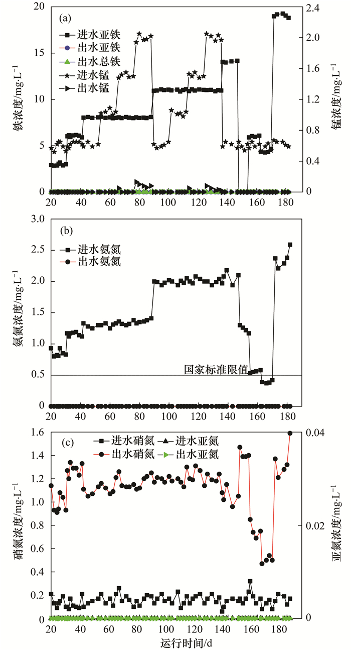 進(jìn)出水鐵錳氨濃度變化如圖 2.亞鐵在生物濾柱中主要通過化學(xué)接觸氧化作用去除, 而錳在生物濾柱中主要通過生物作用去除, 由圖 2(a)可知, 在運(yùn)行過程中出水總鐵和出水錳均能滿足《生活飲用水衛(wèi)生標(biāo)準(zhǔn)》(GB 5749-2006)中對(duì)總鐵和錳的限值要求.由圖 2(b)可知, 在整個(gè)過程中出水氨氮濃度亦均能滿足標(biāo)準(zhǔn)中對(duì)氨氮的限值要求, 且由圖 2(c)可知, 在整個(gè)過程中出水硝氮濃度均遠(yuǎn)大于進(jìn)水硝氮濃度, 由此表明, 在此濾柱中氨氮能較好地通過生物作用去除.